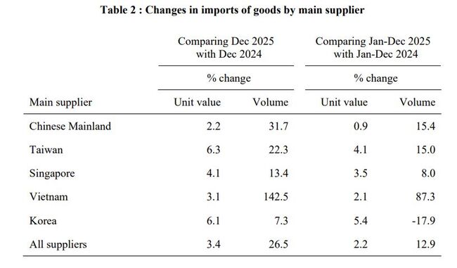2025년 12월과 2024년 12월을 비교했을 때, 모든 주요 공급국으로부터의 수입 물량이 증가했습니다. 베트남(142.5%), 중국 본토(31.7%), 대만(22.3%), 싱가포르(13.4%), 한국(7.3%) 순으로 증가했다.