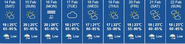 일요일과 설날 전날은 따뜻하고 비교적 습한 날씨가 예상되며, 춘절 17일 당일에는 낮 동안 날씨가 뚜렷하게 변할 것으로 예상된다. 대체로 흐린 날씨에 해안가에는 안개가 끼고 한두 차례 소나기가 내릴 가능성이 있다. 도심 기온은 최고 26°C까지 오르다가 자정 무렵에는 20°C 정도로 떨어질 것으로 예상된다.
