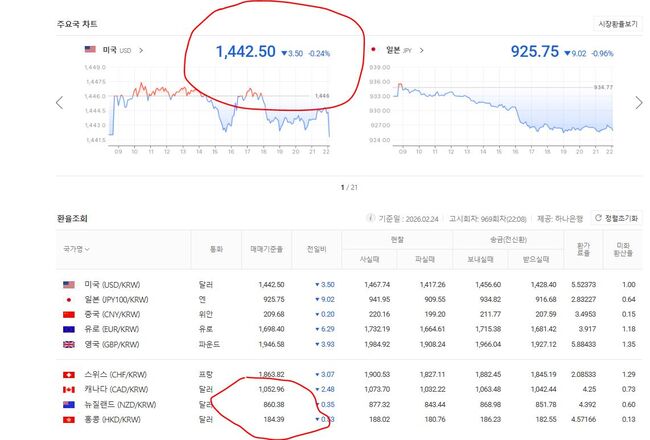 2월 24일 원/미달러 기준환율 1,442.50, 원/홍콩달러 기준환율 184.29
