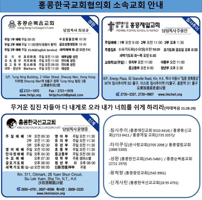 ▲▲홍콩한국교회협의회교회: ※왕척항(홍콩중앙교회(2545 9901) ※성완(홍콩한인교회(2545-5460 ) / 홍콩순복음교회(2721 1970)※침사추이(홍콩동신교회(2723 6411/홍콩제일 교회(2735 3357)/홍콩애진교회(9310 4414 ※타이쿠싱(온사랑교회(3705 2098)/ 홍콩엘림교회(2886 5300) ※신계사틴(홍콩한국선교교회(26 95 4791)