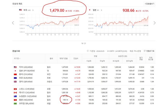 3월 5일 원/미달러 기준환율 1,479, 원/홍콩달러 기준환율189.14