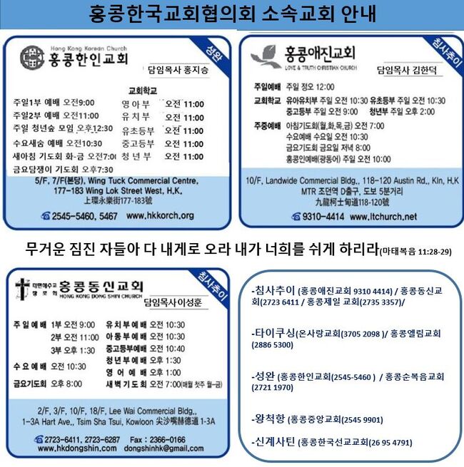 ▲▲홍콩한국교회협의회교회: ※왕척항(홍콩중앙교회(2545 9901) ※성완(홍콩한인교회(2545-5460 ) / 홍콩순복음교회(2721 1970)※침사추이(홍콩동신교회(2723 6411/홍콩제일 교회(2735 3357)/홍콩애진교회(9310 4414 ※타이쿠싱(온사랑교회(3705 2098)/ 홍콩엘림교회(2886 5300) ※신계사틴(홍콩한국선교교회(26 95 4791)