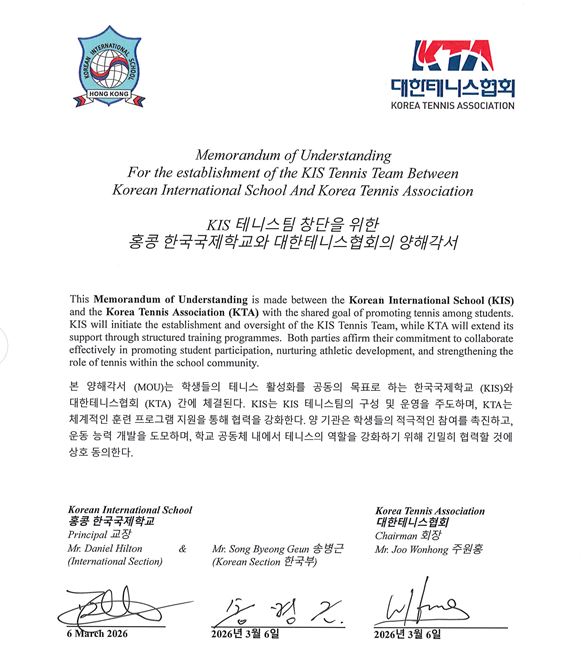 한편 이번 업무협의 체결은 대한 테니스 협회 김종범 이사와 이종석 운영위원장의 주선으로 준비되었으며 앞으로 KIS는 학교 차원에서 테니스팀 구성과 운영을 주도하고, 대한테니스협회는 체계적인 훈련 프로그램을 지원함으로써 양 기관의 긴밀한 협력을 이어갈 예정이다. 이번 파트너십이 홍콩 내 한인 사회와 학생들에게 새로운 활력이 될 것으로 기대된다.