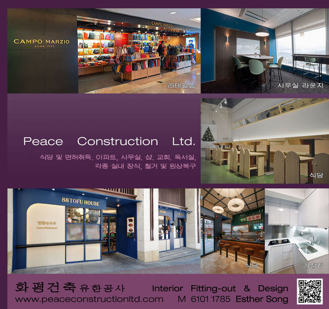 ■ 화평건축 : 아파트, 사무실, 식당, 매장, 교회 모든 실내장식 및 원상복구, 면허취득, 문의환영: 6101 1785(에스더 송)