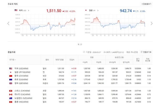 3월 29일 원/미달러 기준환율1,511.50, 원/홍콩달러 196.77
