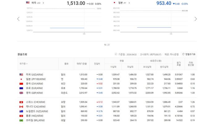 4월 1일 원/미달러 기준환율 1,513, 원/홍콩달러 기준환율 196.83