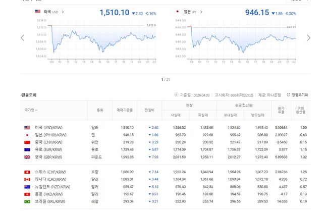 4월 3일 원/미달러 기준환율 1,510.10, 원/홍콩달러 기준환율 192.67
