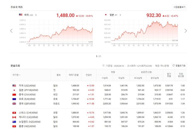 4월 12일 원/미달러 기준환율 1,488, 원/홍콩달러 기준환율 193.72