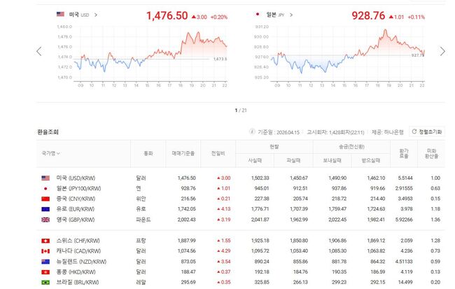 4월 15일 원/미달러 기준환율 1,476.50, 원/홍콩달러 기준환율 192.18