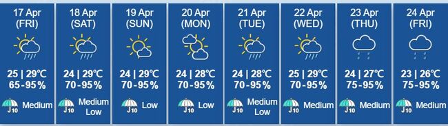 두 개의 저기압골과 상층 기압골이 금요일부터 4월 25일까지 중국 남부 해안에 영향을 미칠 것으로 예상됨에 따라 기간 동안 소나기가 예보되었으며, 4월 22일부터 24일 사이에는 국지적으로 천둥번개가 칠 가능성이 있다.