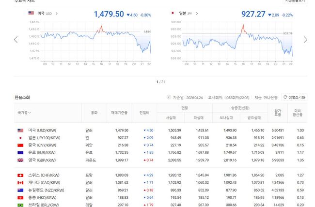4월 26일 원/미달러 기준환율 1,479.50, 원/홍콩달러 기준환율 192.54