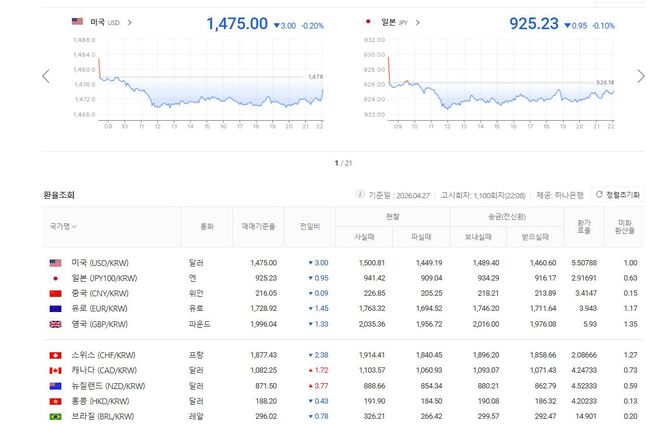4월 28일 원/미달러 기준환율 1,475, 원/홍콩달러 기준환율 191.90