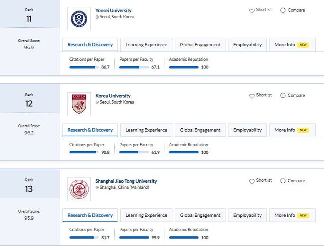 한편, 한국내 대학교는 아시아대학 순위에서 국내 대학이 상위 10위권에 들지 못했다. 연세대 11위·고려대 12위· 성균관대 16위, 서울대 17위, 포항공대 18에 올랐다.