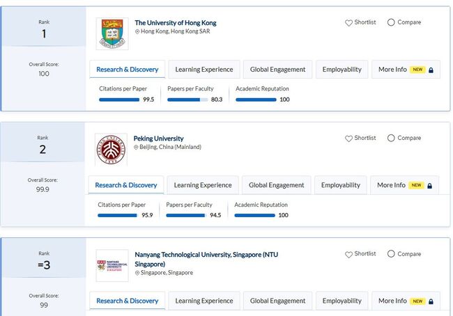 1위는 홍콩대, 2위는 중국 베이징대, 3위는 싱가포르 난양기술대이다. 싱가포르국립대(4위), 중국 푸단대(5위), 홍콩과학기술대(6위), 홍콩시립대·홍콩 중문대학(공동 7위), 중국 칭화대(9위), 홍콩이공대(10위) 순이었다.