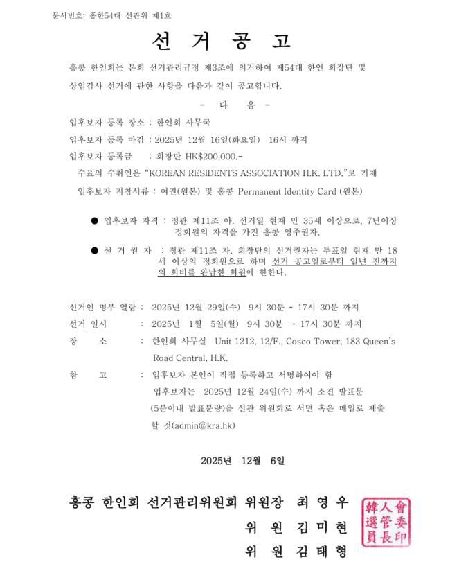 ■ 제 54대 한인 회장단 및 상임감사 선거 공고
