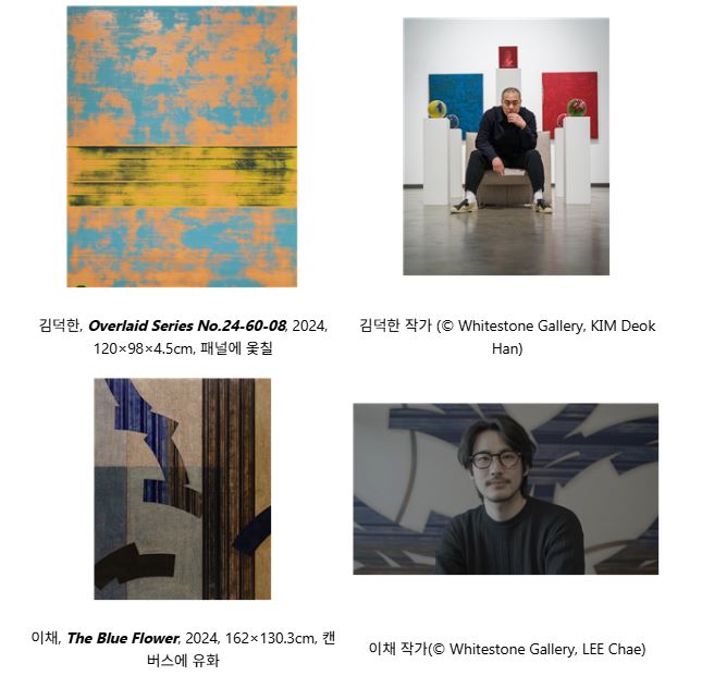 김덕한은 나무 패널과 금속 위에 옻칠 물감을 겹겹이 쌓아 기억과 감정을 담은 색채를 만들어내며, 이채는 꽃과 나무의 피고 지는 자연의 순환을 상징적·추상적으로 표현해 생명의 지속과 깨달음을 탐구한다.
