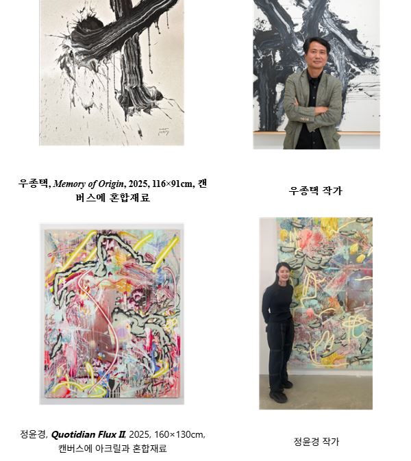 우종택은 먹과 목탄, 백토 등을 활용한 강렬한 제스처로 자연과 우주의 본질을 묻는 명상적 회화를 제작하고, 정윤경은 동아시아 수묵 전통과 서구 추상 표현주의를 결합해 여백과 구조가 어우러진 독창적 화면을 구현한다.