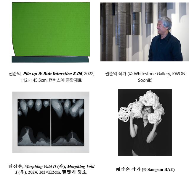 배상순은 검은 벨벳 위에 물감을 겹겹이 올려 생명력과 사고의 흐름을 탐구하는 「Morphing Void」 시리즈를 선보이며, 혼돈과 창조 사이의 긴장을 표현한다.