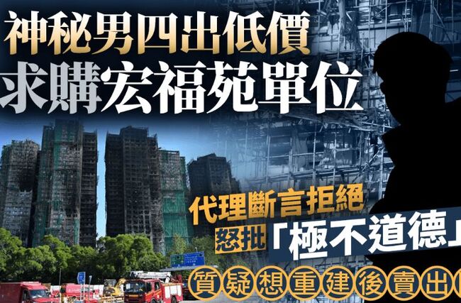 익명의 두 명의 부동산 중개사에 따르면, 안경을 쓴 이 남성은 약 2주 전 5호 화재로 피해를 입은 이 공공주택 단지 내 아파트 5채를 hkd600만 에 매입하겠다고 제안했다. 이는 아파트 당 평균 hkd120만으로 구매하겠다는 것이다.