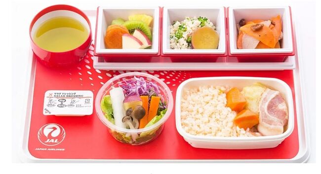 일본항공은 데리야끼 치킨, 밥, 된장국 같은 일본 전통 요리와 서양식 메뉴가 조화롭게 어우러진 아름다운 기내식을 제공한다.