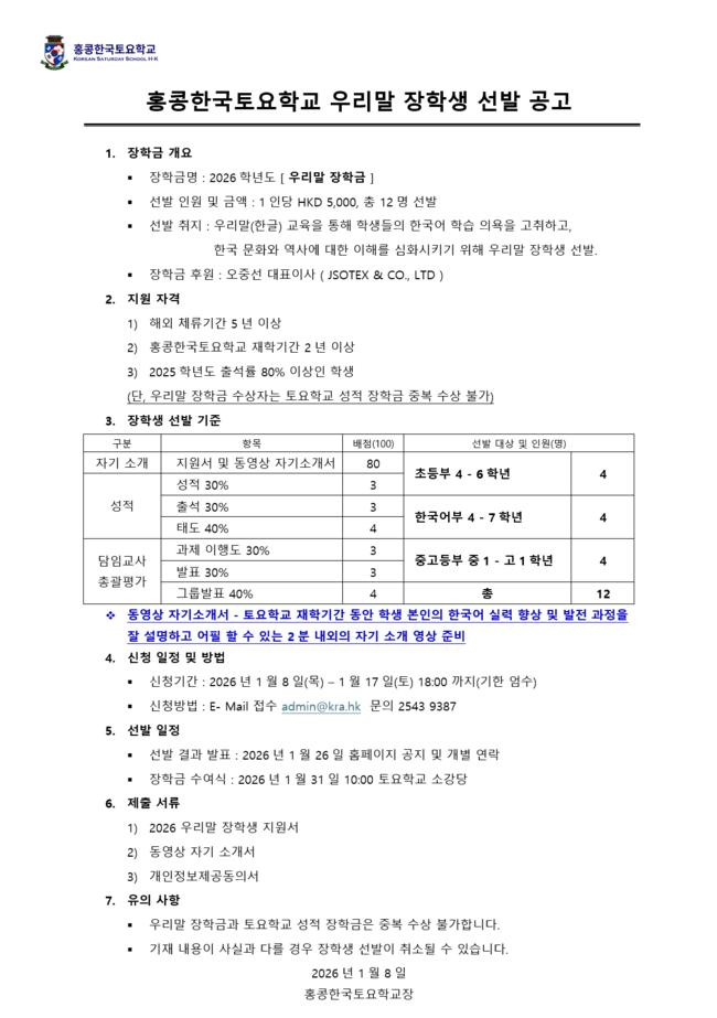 홍콩한국토요학교 우리말 장학생 선발공고