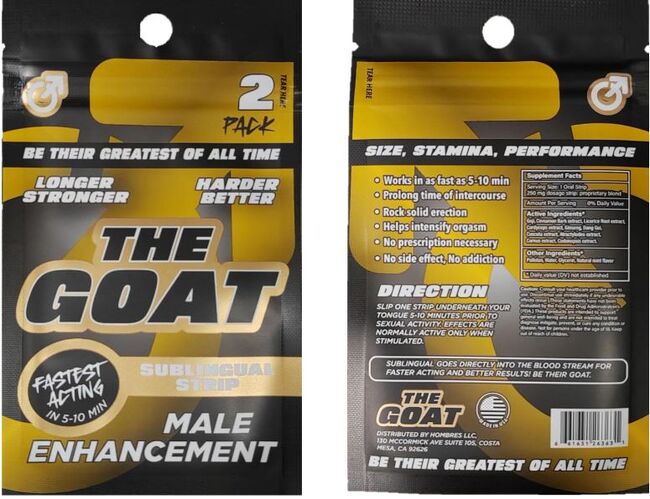 "염소 설하정(The Goat Sublingual Strip)"이라는 제품(사진 참조)에는 경구용 알약에는 천연 남성 정력 강화 제품이라고 표기되어 있었다.