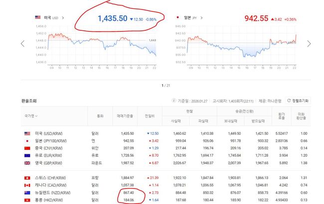 1월 27일 원화/미달러 기준환율 1,435.50, 원화/홍콩달러 기준화뉼 184.06