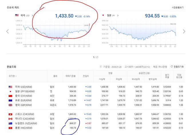 1월 28일 원화/미달러 기준환율 1,433.50, 원화/홍콩달러 183.74