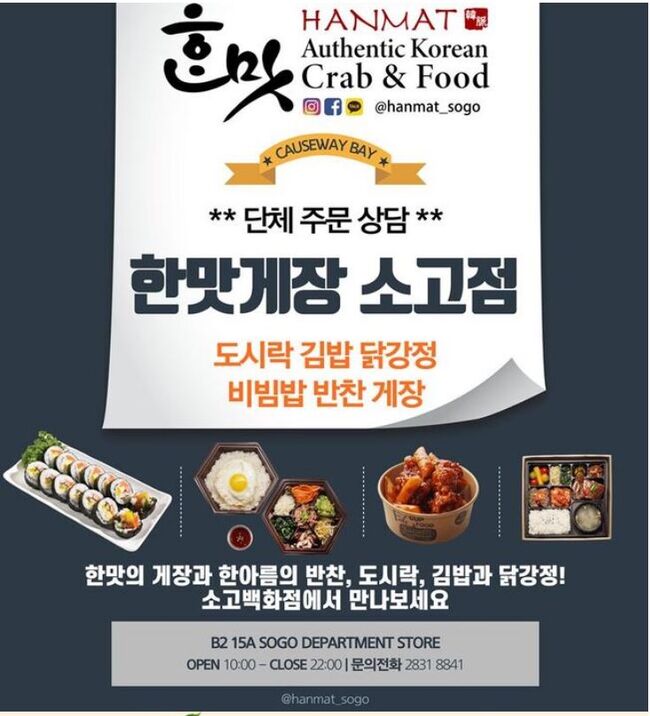 ■ 한맛 도시락, 반찬가게 : 소고백화점 B2 15A 게장, 김밥, 닭강정, 비빔밤 등 문의 2831 8841 방문 추천