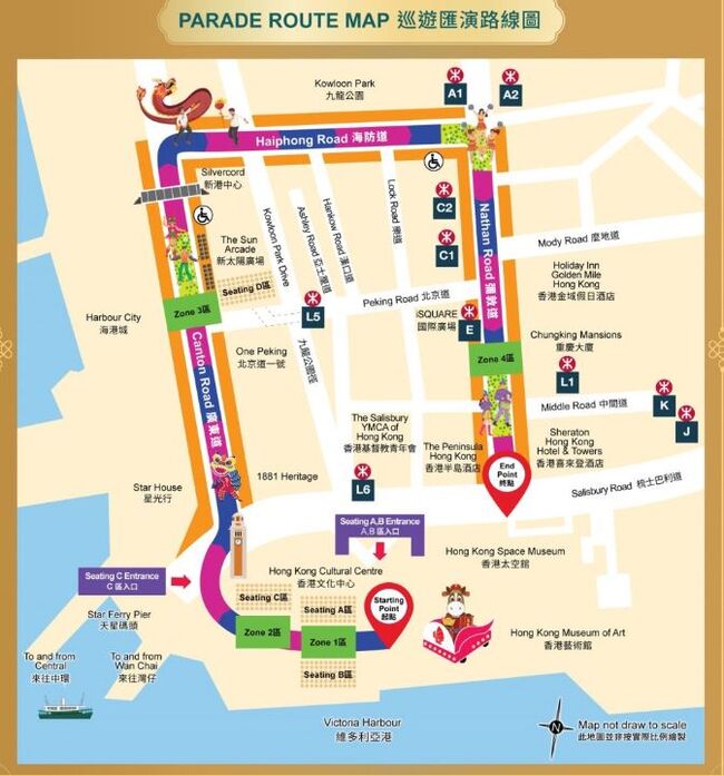 퍼레이드는 오후 8시에 홍콩 문화센터 광장에서 시작하여 캔톤 로드, 하이퐁 로드, 네이선 로드를 따라 행진한 후 쉐라톤 홍콩 호텔 근처에서 마무리된다.