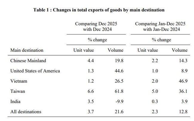 2025년 12월과 2024년 12월을 비교했을 때, 대만(61.8%), 미국(44.6%), 베트남(26.5%), 중국 본토(19.8%)로의 총 수출 물량은 모두 증가했습니다. 반면, 인도로의 총 수출 물량은 9.9% 감소했다.