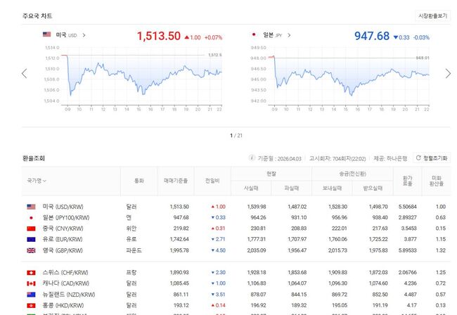 4월 5일 원/미달러 기준환율 1,513.50, 원/홍콩달러 기준환율 196.92