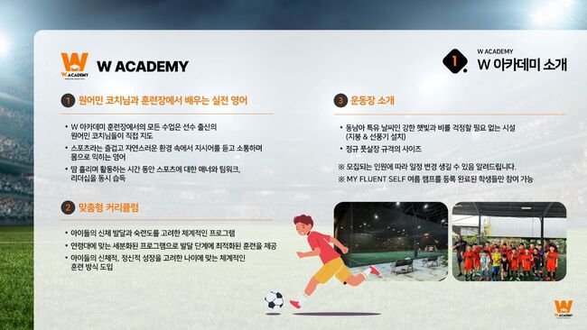 - W Academy 축구캠프 등록 가능 (타 영어캠프 등록자 참여 불가)