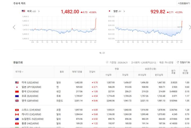 4월 21일 원/미달러 기준환율 1,482 원/홍콩달러 192.97