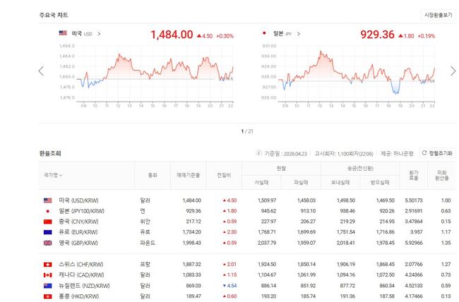 4월 23일 원/미달러 기준환율 1,484, 원/홍콩달러 기준환율 193.20